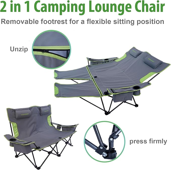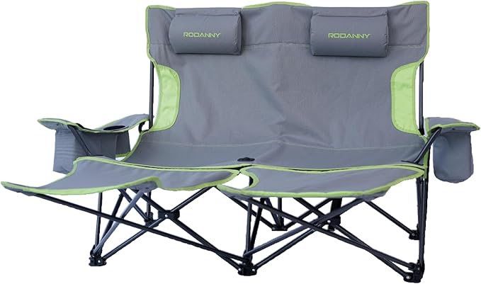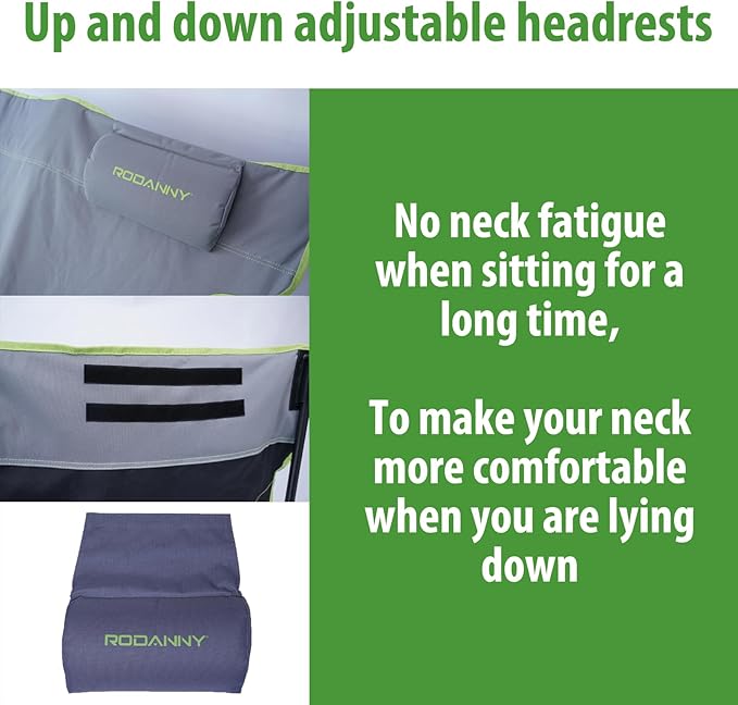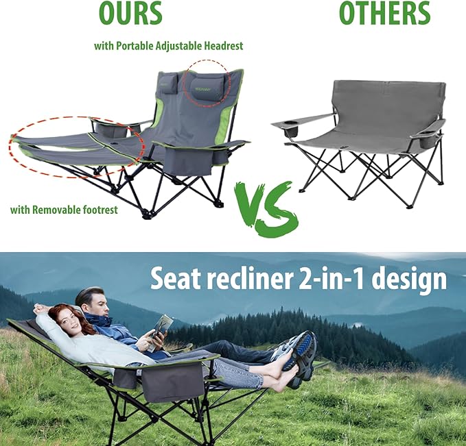 • 【Detachable Headrests And Footrests 】 – Our double camping chair also features two detachable headrests and footrests. The installation is not complicated. (Please refer to the pictures and installation instructions.) Our camping chair allows your body to rest while also providing greater relaxation for your head and feet.